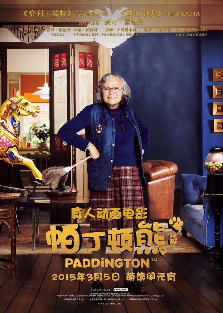 在发布的中文版人物海报中,妮可•基德曼饰演的要将帕丁顿熊制作成标本的大反派身穿白色长裙,表情冷酷,突出了冰冷无情的姿态。莎莉•霍金斯饰演收养帕丁顿熊的布朗太太,她善良温婉穿着得体,浓浓的英伦风令人眼前一亮。彼得•卡帕尔蒂饰演帕丁顿熊的邻居柯里先生,他翘着二郎腿,散发着不屑,想必是位不好惹的角色。老戏骨朱丽•沃特斯饰演的管家奶奶和蔼可亲,她对小熊爱护有加,吉姆•布劳德本特饰演的古玩店老板崭露搞怪本领。而休•博内威利饰演的布朗先生眉头微皱一脸无奈,西服外套上还留着小熊的爪印,想必小熊在地铁里又调皮任性,上演了令人捧腹大笑的好戏。