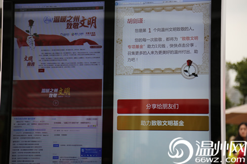 与此同时,网友通过一个小小的举动,就可以向身边的文明致敬。活动期间,温州网通过卫星直播车、手机直播等方式对“致敬文明”活动进行现场直播,并做专题报道。网友可以对专题上的文明现象和文明人物进行点赞、转发分享,网民的每一次致敬转发,系统将生成一份“致敬文明”证书,每一次点赞转发,都将由温网爱心屋为“致敬文明”专项基金募集1元钱。