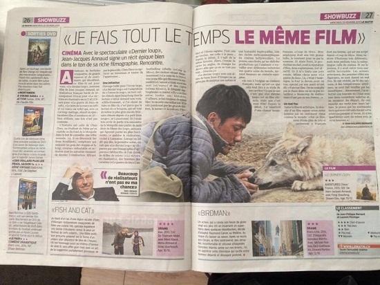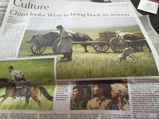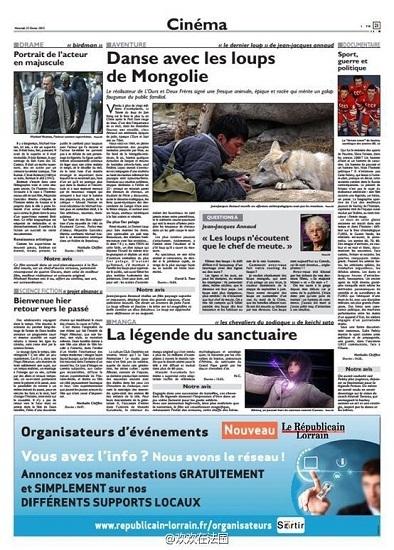 作为法国极具影响力的导演,让.雅克.阿诺为了《狼图腾》在法国的上映,进行了密集宣传,收视率最高的几大新闻、主流脱口秀都见其身影。而正值中法建交五十周年,法媒对该片也给予了极高的关注度。纸媒方面,最具权威的《世界报》头版和文化板块给出四个版面的重点报道,全国性日报《费加罗报》、《解放报》、《巴黎人报》以及各大地方性报纸、免费报纸、周刊均有报道。此外,《国际纽约时报》、BBC等世界著名媒体也对影片进行了报道。