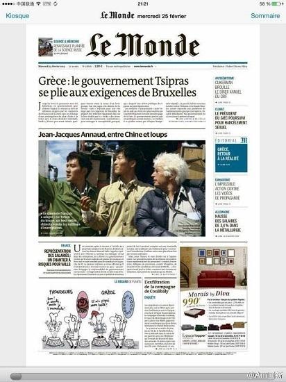 腾讯娱乐讯电影《狼图腾》于近日正式突破4亿票房大关,26日,该片在法国全面上映,以首日超8万人的观影人次战胜新晋奥斯卡最佳影片《鸟人》,在同期上映新片中排名第一。影片在全球范围内收获极大关注,被《世界报》、《国际纽约时报》、BBC等全世界多家重量级媒体争相报道。而男主角冯绍峰(微博)(微信号:fengshaofeng1007)也成为外国观众眼中的新鲜面孔。凭借这部良心之作,他正式迈出走出国门的第一步。