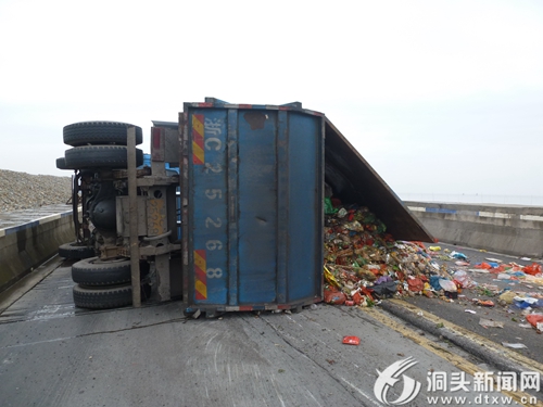 为避行人洞头一货车发生侧翻 车上垃圾洒满地