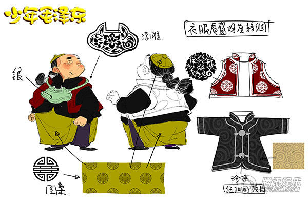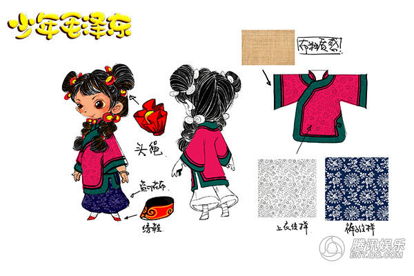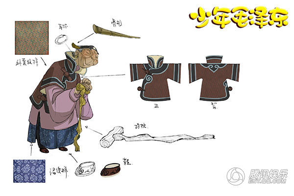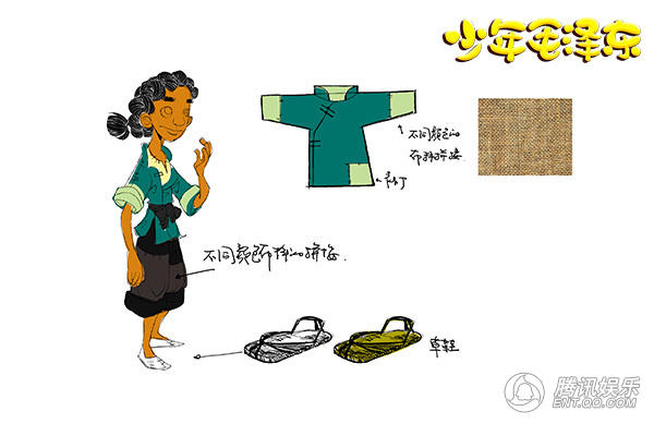 此次曝光的系列角色设计原稿中,包含了电影中的各大主要人物,男主角石三伢子毛泽东从头顶到脚尖都被一一分解逐个精细设计,剃掉头发后留下的黑色阴影、粗布料质感的外衣、比外套稍细腻的内搭、盘结的发辫、近似黑色布质感的布鞋等细节都显示出设计者的用心。甚至连邹奶奶的耳环、文七妹的耳坠这些小饰品都精心准备。