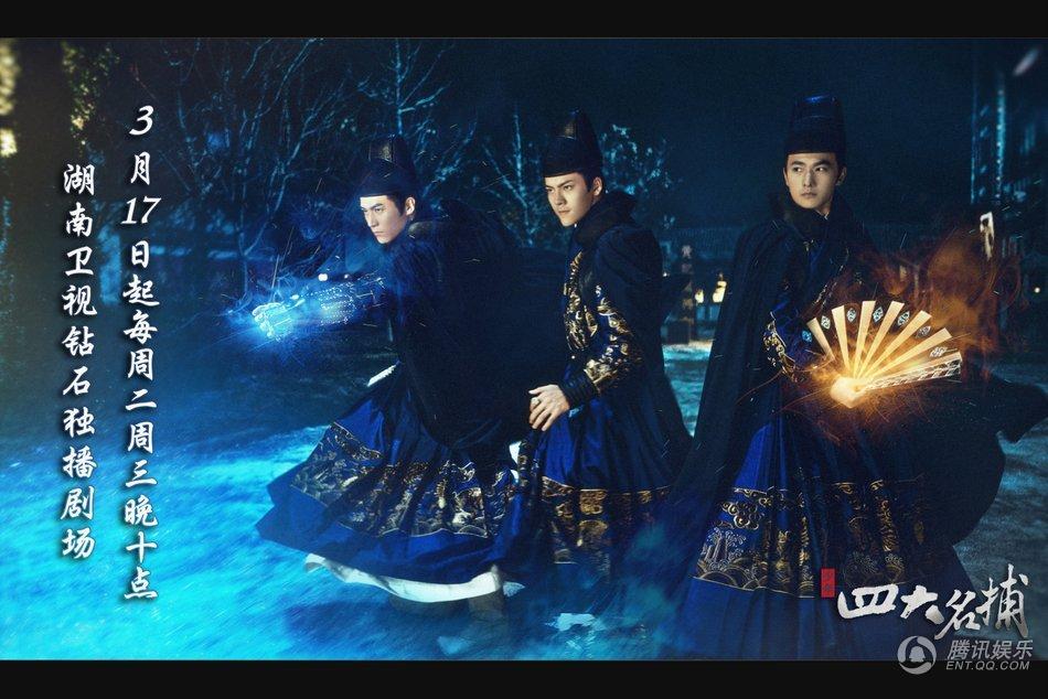 腾讯娱乐讯由欢瑞世纪、光线传媒联合出品,张翰、何晟铭(微博)、杨洋、陈伟霆(微博)、茅子俊、张钧甯(微博)、贾青(微博)、吴映洁(微博)(微信号:wu-ying-chieh)等主演的盛世美颜谜侠情巅大剧《少年四大名捕》将于3月17日晚10点登陆湖南卫视钻石独播剧场,强势开播。《少年四大名捕》改编自温瑞安经典武侠名著“四大名捕”系列,讲述了冷血、无情、追命、铁手四大名捕护卫京城、屡破奇案,与安世耿展开了一场正邪较量的故事。日前,该剧曝光了湖南卫视系列宣传片,由张翰、杨洋、陈伟霆、茅子俊饰演的四大名捕悉数亮相,宣传片中陈伟霆饰演的追命神秘消失,引发了一场紧张刺激的追踪之旅。