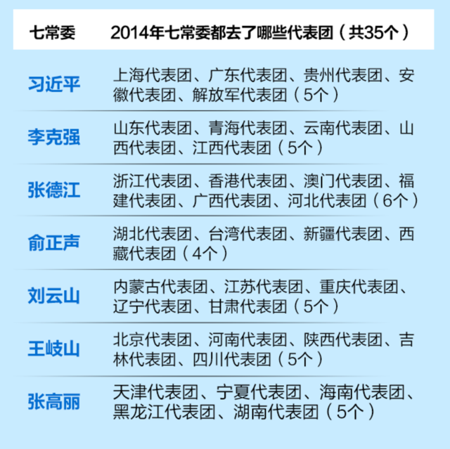 2014年人代会期间,七常委都去了哪些代表团?咱们列个图表,看个明白。