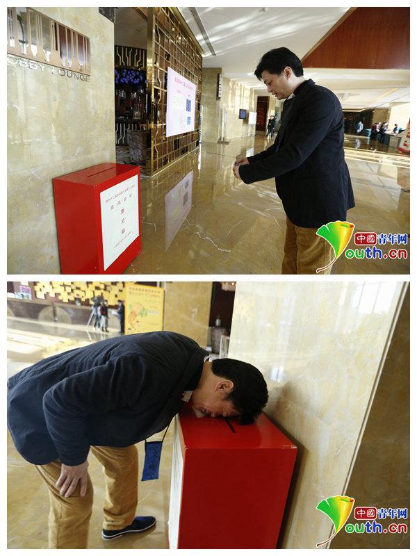 崔永元自拍“两会”:俯身查看会风会纪意见箱