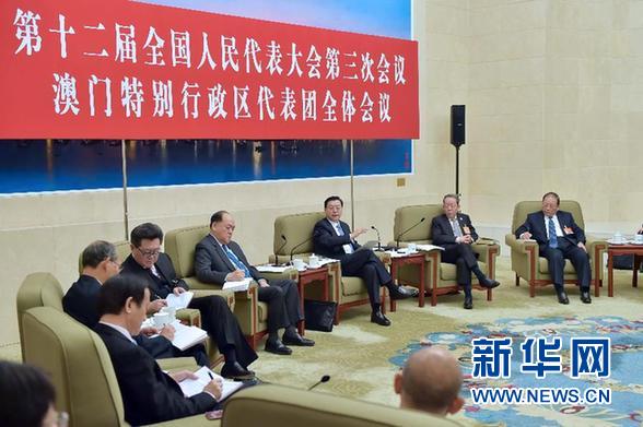 3月6日,中共中央政治局常委、全国人大常委会委员长张德江参加十二届全国人大三次会议澳门代表团的审议。 新华社记者 李涛 摄