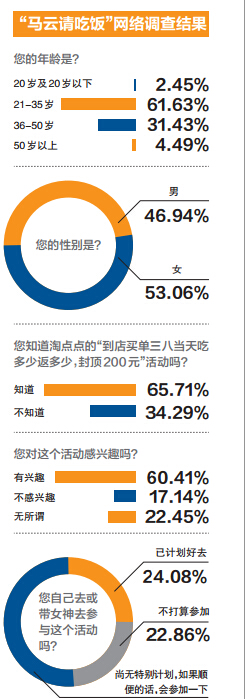有受访者认为活动优惠力度不够、操作不方便。“马云有点坑啊!”市民曹女士抱怨道,她先后在一鸣、百滋百味就餐,都没有抽中红包,看来想蹭马云的饭并不容易。浏览过与“淘点点”合作活动商家列表后,不少市民反映,这些餐馆不是自己平时常去的。