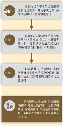 正当李小姐满心期待收货的时候,第二天却接到该团购APP的“客服电话”,告知其订单出问题发不了货,需要加“客服QQ”重新操作。因为之前那次成功愉快的团购经历,李小姐不疑有他,加了“客服QQ”,然后对方发了个网站链接,再按要求依次填写了姓名、身份证、银行卡卡号和密码,还转发了手机上收到的验证码……随后就是银行卡里的钱被骗子转走。