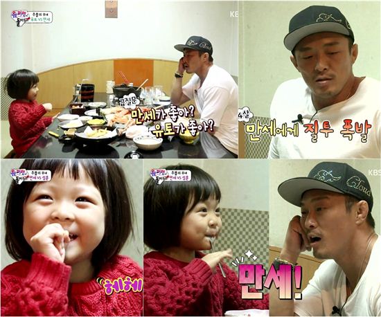 节目中,秋成勋带着小爱来到了雪国北海道,在参观了企鹅、泡了露天温泉、给妈妈制作了巧克力后,父女俩来到了美食店吃螃蟹。大快朵颐后,秋成勋突然问小爱“喜欢妈妈还是万岁”,小爱露出害羞的微笑坚定地选择了万岁,让秋成勋大吃一惊,接着又问到“喜欢爸爸还是万岁”,小爱的回答仍是万岁,有些接受不了现实的秋成勋说“你是不是太过分了”,受伤的表情也让大家忍俊不禁。