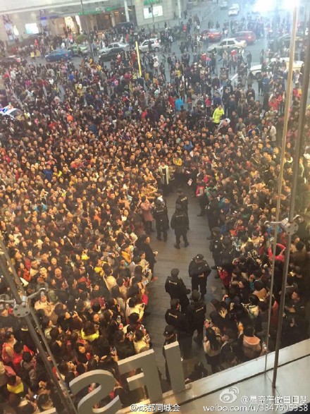 3月9日20点09分,成都同城会官方微博发布跑男的最新录制消息,称:“跑男原计划今晚10点,将在成都国际金融中心录制撕铭牌大战!但据网友说,因人太多,IFS广播已通知,节目录制取消。快点回家去吧,楼上楼下,里三层外三层,全是人……”并曝商场围观群众照片。从照片中看出,商场楼上楼下包括楼梯都是人,已将维持次序的保安人员都围的无法工作。