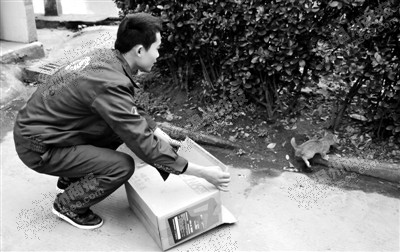 几个师傅左右夹击,最终将小猫赶到了事先准备好的纸箱里。小猫在箱子里不时跳跃,还咬下了一位伸手想要抱它的师傅的手套。