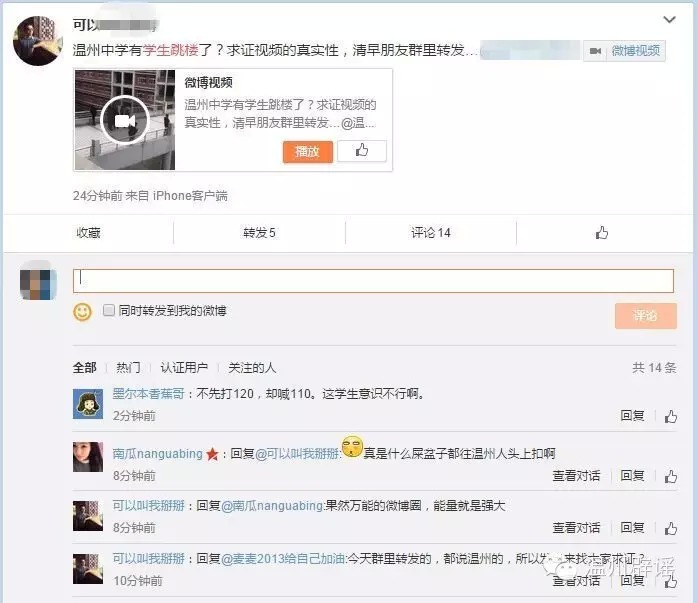 网友@麦麦2013给自己加油:传的人肯定是看过新闻和原视频的,计量学院的硬要套温州中学头上,居心何在?欺骗我们不知道真相的人。