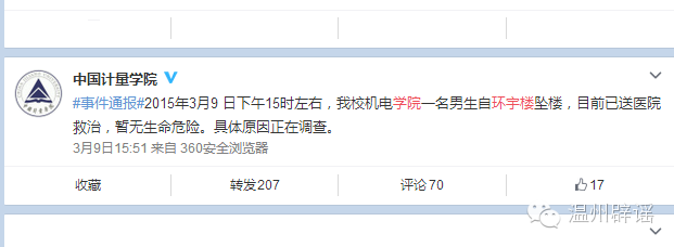 据中国计量学院官方微博消息:2015年3月9日下午15时左右,我校机电学院一名男生自环宇楼坠楼,目前已送医院救治,暂无生命危险。具体原因正在调查。