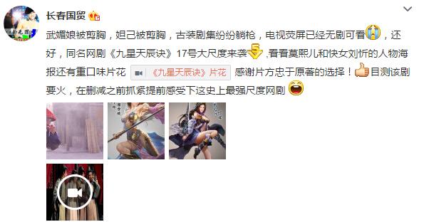 红网3月12日报道继《武媚娘传奇》、《封神英雄榜2》等剧集遭遇“剪胸”之后,很多制作单位将目光转向了审查较松的网络剧。昨日,知名博主长春国贸在微博曝光了一部《九星天辰诀》同名网剧的人物海报与片花,"快女"刘忻、莫熙儿等女星的性感大尺度人物造型,以及街头僵尸啃生肉的剧情曝光后,引发网友一片热议,很多网友纷纷表示:“看完血脉喷张流鼻血,直呼最强尺度”。