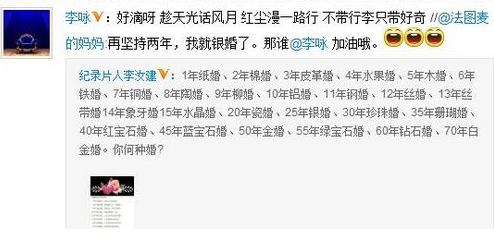 昨晚,纪录片导演李汝建在微博分享一篇文章,介绍婚姻年限的叫法和意义。之后哈文转发了该微博,并“喊话”老公李咏:“再坚持两年,我就银婚了。那谁(@李咏)加油哦。”