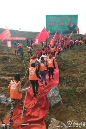 有多张现场图片显示,在一片空旷的小山坡上,上百名身穿橙色或红色志愿者衣服的活动参与人员,手持锄头等植树工具,正踩着红地毯走向活动现场。红地毯尽头,是一个临时设置的舞台,上面竖立着一巨幅宣传板,上面写着“零陵区巾帼志愿者成立暨绿色生态·巾帼林·共青团基地揭牌仪式”。