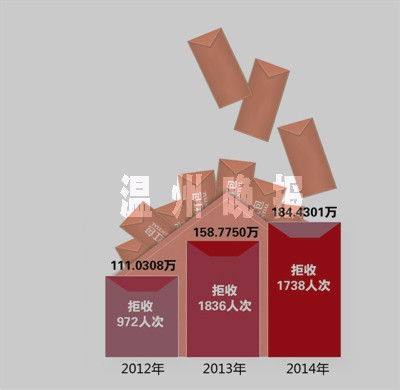温州网讯 前天,市卫计委廉政行风会议召开,会上公布,去年我市市区10家医院共拒收红包1738人次,总金额为1844301元。并且,年拒收金额数近3年来都以20%的比例上升——市卫计委透露,2012年我市市区医院拒收红包972人次,总金额为1110308元;2013年拒收1836人次,红包总金额为158.775万元。