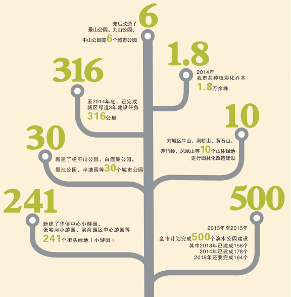 自2010年我市打响“绿色战役”,到2013年底,按照建成区面积204.9平方公里,城市人口192.78万人计算,我市建成区绿地率达到33.36%、绿化覆盖率达38.07%、城市人均绿地11.32平方米。