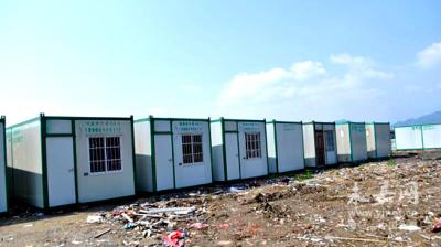进入垃圾堆放场,靠近瓯江边的空地上摆满了集装箱,每个集装箱开有窗户和门,有的还上着锁,一些集装箱上都喷绘了广告字,内容为“曙康租金每天6元”,下方还有联系电话。原来这些集装箱式的房屋是出租住人的,共有10多个。再进去是一处临时厂房,厂房里摆放着许多加工集装箱的材料。