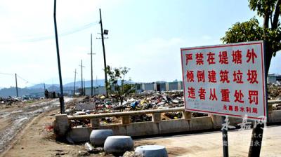 从鱼塘处的堤坝一路走到瓯江三桥东面,堤坝外是一处很大的建筑垃圾堆放场。由于倾倒的垃圾太多,滩涂已经被填高,最高的地方高出堤坝好几米。
