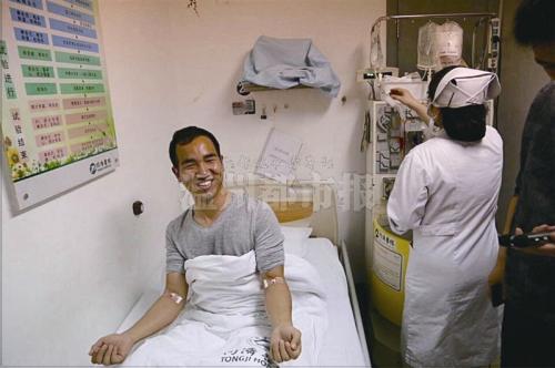 图①:湖北小伙方先生在武汉同济医院接受造血干细胞采集。