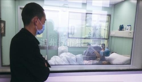 图③萌萌的父亲站在移植仓外注视妻子和女儿。