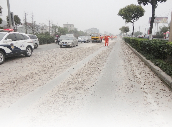 随后,乐成公路管理所立刻组织人员赶往现场,发现长约200米、宽9米的路面上铺满了石子,过往车辆纷纷避让,而肇事车辆早不见踪影。于是,工作人员立即在现场设置安全警示标志,指挥过往车辆缓慢通行,养护工人则用铁锹、扫帚等工具清扫路面石子。