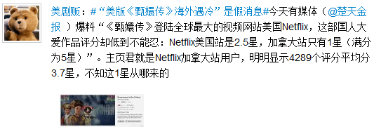 对于该媒体报道的《甄嬛传》“水土不服”海外遇冷,有网友贴出Netflix加拿大站的页面截图,上面显示《甄嬛传》在4289个观众的评分中平均3.7星,指媒体消息虚假,质疑“不知这1星从哪来的”。