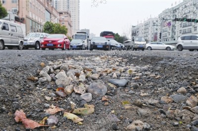 昨天上午,记者在现场看到,双向车道各有十几处路坑零星分布。在环镇北路和塘下大道的交汇处,记者发现一个约1米宽4米长的大坑横亘在红绿灯路口,完全挡住了2个直行车道。这大坑由几个小坑组成,最深处约15厘米。绿灯时,直行车道上的车辆只好借用左转、右转车道通过。一些强行驶过大坑的车辆,车身都会剧烈地抖动。