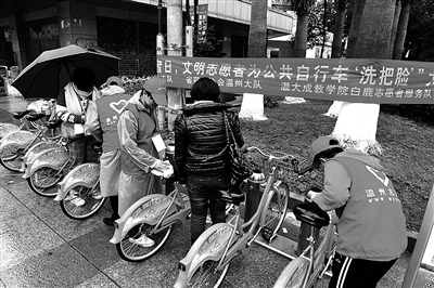志愿者在清洗公共自行车。 杨冰杰 摄