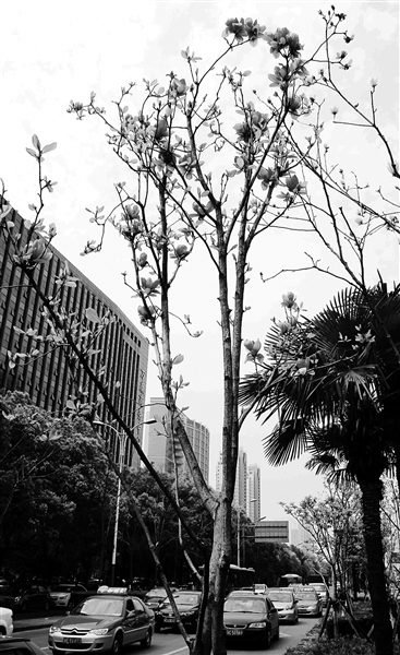 锦绣路绿化带中盛开的多彩玉兰花。 陈翔 摄