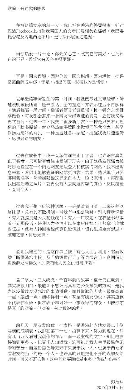 腾讯娱乐讯(文/付超)3月26日,香港导演彭浩翔发布名为《欺骗,有违我的底线》的网络长文,直言因为过去一年,饱受网络谣言困挠,自己已于昨日(3月25日)在律师陪同下到香港警署报案。随后,其所在的正在电影公司也随即发布公告,表示“今后,若有个人和单位继续恶意散布有关捏造信息,将会追究相关责任”。