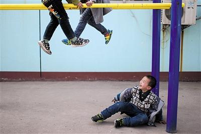 坤坤在和同学玩双杠时跌倒大笑,从开始进校园几天一言不发,到现在每天像正常孩子一样学习生活,坤坤在发生着变化。