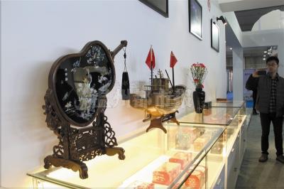传统经典馆内贝雕等工艺美术作品吸引市民观看。