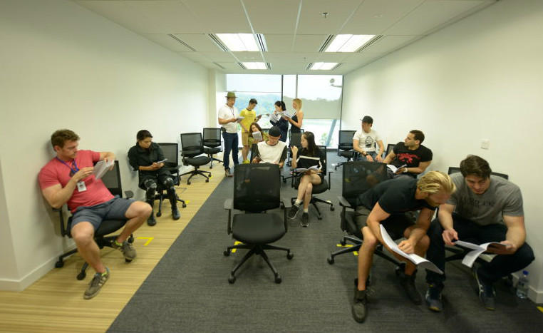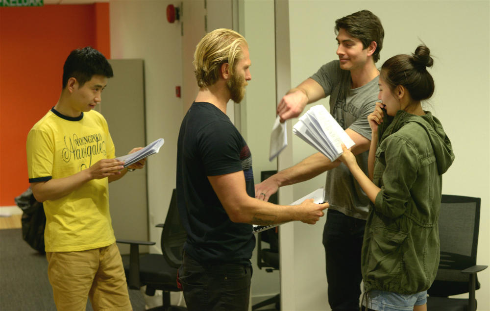 腾讯娱乐讯昨日,由“超人”布兰登·罗斯、性感女星张雨绮(微博)等联袂主演,好莱坞制作团队倾力打造的科幻冒险电影《蒸发太平洋》在马来西亚著名的影棚PINEWOOD基地正式开机。彩排现场照中,“李连杰(微博)师弟” Russell Wong、廖碧儿、蒋梦婕、王阳明、吴天瑜、Tazito Garcia、Kaiwi Lyman等实力演员组成“六国”阵容。其中,久未露面银幕的张雨绮以工作状态露面,投入自己的首部英语对白电影,身着灰色帽衫,绑着俏皮的丸子头,全素颜的她气色颇佳,与国际班底合作融洽,显得颇为享受。