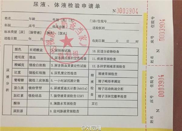 腾讯娱乐讯3月31日,演员刘冠翔在网上晒出一张尿液、体液体检单,并表示:“拍戏十五年…这样的事情还是第一次遇到…”