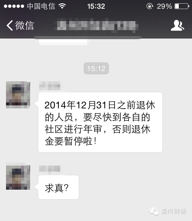 3月31日,网友 @ 昨日成永恒 向温州辟谣举报平台发来一则求证信息:“2014年12月31日之前退休的人员,要尽快到各自的社区进行年审,否则退休金要暂停啦!”