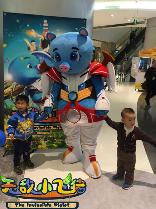 在活动现场,人声鼎沸,莺莺燕燕,欢声笑语一片。首先,在入口处,深受孩子们喜欢的熊大、熊二、光头强和憨态可掬的小飞猪真人卡通秀在欢迎各位宾客的到来,发放《无敌小飞猪》特意为小朋友定制的课程表,赠送猪鼻子、精灵耳等小道具,并热情的与小朋友们合影留念,互动拍照;小朋友们捏捏猪猪的鼻子,拍拍强哥的光头,嘻嘻哈哈,不亦乐乎;一群孩子围绕在小飞猪真人秀玩偶旁边,索要签名,叽叽喳喳的询问电影《无敌小飞猪》的放映时间及精彩故事情节,津津有味的听“小飞猪”讲述来自外星球的故事......