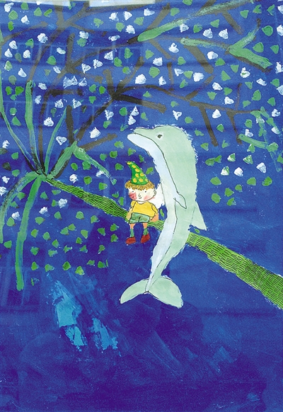 今天上午,如果你去市区杨府山公园,正门入口处应该能看到“几米”的画展:天蓝色的背景下,孤独的孩子与海豚一起坐在树枝上;