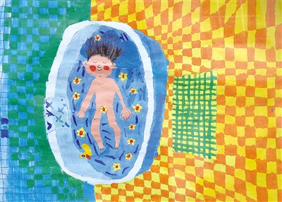 橙黄的浴室地面,男孩惬意地躺在蓝色的浴盆里,身上缀着朵朵黄色的小花……这些色彩明亮的几米仿画,出自一位安静的美男之手,他叫豆豆,是一位自闭症患者,今年21岁。