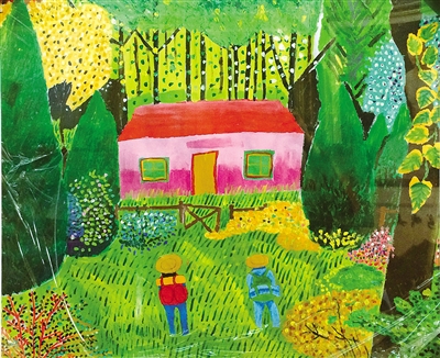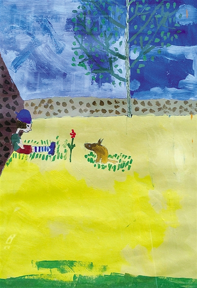 后来,何老师开始教他涂色,学会用水彩笔、丙烯颜料。豆豆的画越来越好,几米画中一些很细节的地方也能模仿出来,比如画树林,豆豆会绕开一片片的树叶,把底色一点点涂上去,遇到颜料缺失,他还会自己调一些简单的颜色。一开始,豆豆的画画在A4纸上,送给志愿者们,大家都叫:“哇,你好棒!”豆豆也是极享受这种成就感,不停地抖手、羞涩地笑。