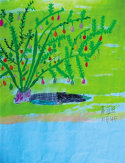 两年前,何老师发现给他一些简笔画,比如一朵花一个小房子,只要看看老师的做法,他就能模仿画得不错,他做数字油画的涂色也很厉害,有时根本不需要看提示图。有一天,何老师拿来一本几米的书,随手翻了几页,递给豆豆说:“豆豆,你画这个吧。”第二天,当老师看到他的画时,被震住了,几乎一模一样。也许,是几米的画特别能打动他。