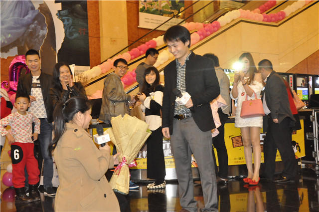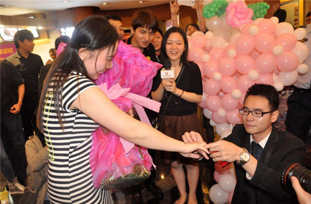 当大家还对这样的特别事件意犹未尽的时候,3月29日晚,现实版《咱们结婚吧》也在深圳橙天嘉禾提前上映,幸福的“我愿意”和如约而至的戒指,当全场冉冉升起的气球和随心而舞的泡泡,让这样一场求婚别开生面。