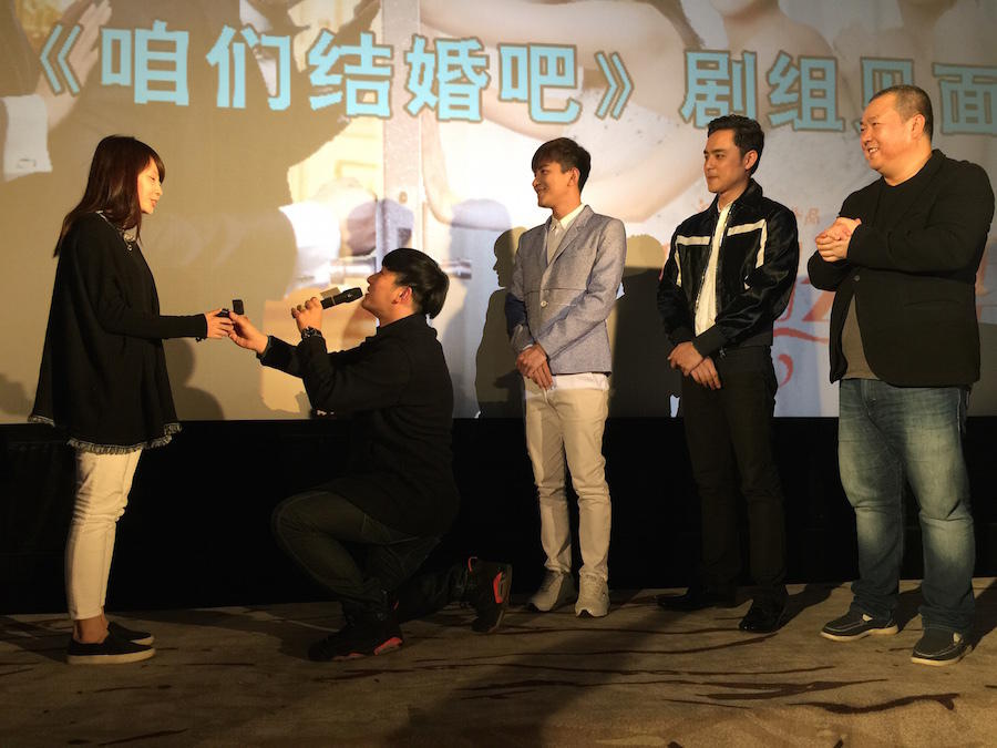 近日,导演携8大主创转战北京、杭州、上海、苏州、广州、武汉、昆明、济南各地巡回路演,各地掀起“结婚吧”热潮。其中昆明医科大学的同学说:“我们班七十几个同学都看了,我们是最后几个。”而昆明上影影城映后见面会的观众群是最年轻的一场,提问观众超过半数是高中生,着实是叫座又叫好的全民合家欢电影。济南站路演巡回时,5对新人身穿婚纱礼服集体观看《咱们结婚吧》的喜庆气氛更是电影市场前所未有,在映后见面会上,他们与主创一起给影厅观众派发喜糖,再次彰显了影片本身的欢乐喜庆与引人关注。
