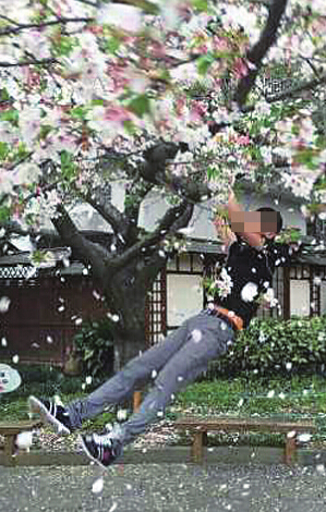 在现场,记者刚好看到了市民所吐槽的一幕。只见樱花树前一名身穿蓝衣的男青年,他手里拿着几朵樱花走了几步后,突然爬上公园木凳,用力摇晃樱花树枝,但没有多少樱花飘落。几分钟后,看没人来阻止,他跳起握住一根粗壮的樱花树枝,剧烈晃动,而旁边一些游客则趁机举起相机,希望能捕捉樱花飘落的“唯美瞬间”。