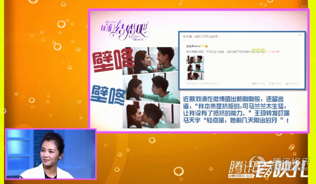 腾讯娱乐讯(文/端梧)前阵,刘涛(微博)(微信号:tamia0712)在微博晒出了被马天宇“壁咚”和唇吻的劲爆剧照,刘涛老公王珂转发:“轻点嘬,她刚治的牙。”这一恩爱秀被《咱们结婚吧》的几位男演员当着刘涛的面好好地调侃了一番。