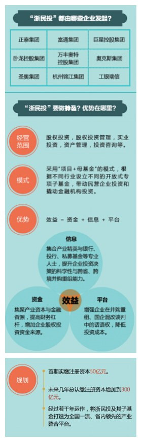 浙江省民营企业数量众多,民营经济发展位居全国前列,但民营经济“小、散、弱”的特征十分明显,制约了企业的盈利能力,也阻碍了支柱产业、战略性新兴产业的发展。为有效化解民营经济转型升级中的诸多问题,去年11月,经浙江省政府同意,在省金融办的指导下,省工商联、省工行、正泰集团等成立“浙民投”筹建组,启动筹建工作。