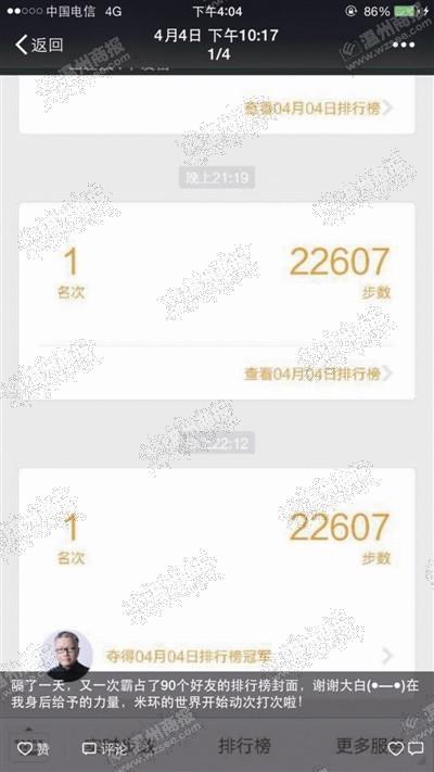 温州网讯 继“咕咚运动”APP、运动手环之后,最近微信朋友圈刮起一股新的“暴走”风潮,就是在微信中添加“微信运动”公众号后,手机就能自动记录你每天的行走步数,再跟朋友圈里的好友PK每日步行运动量。每日排名第一的用户头像和背景还可以占据当日实时排行榜的封面,朋友间还可以点赞,这一系列新鲜的运动社交体验吸引了不少人的关注。