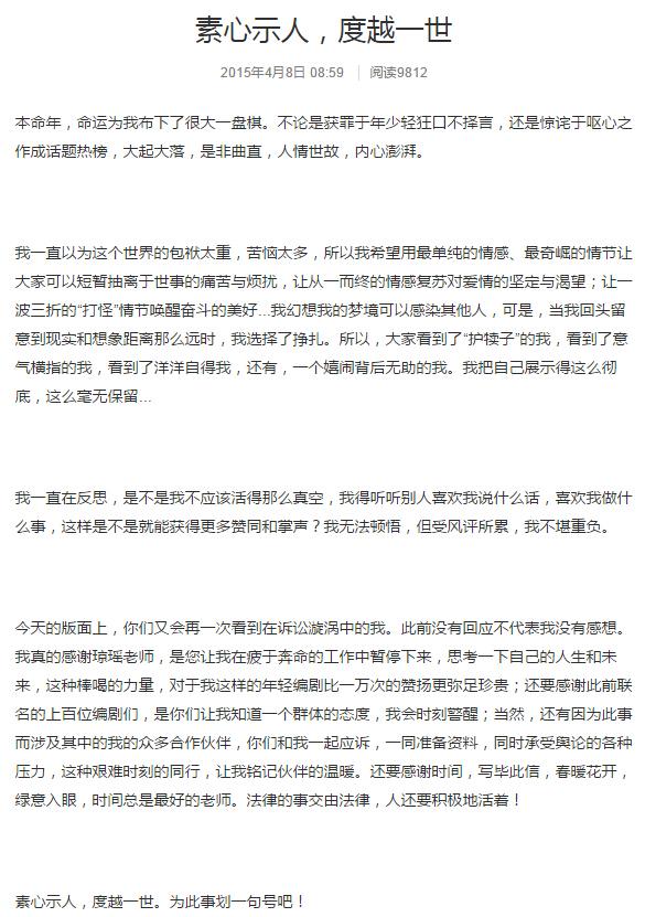 “琼于案”二审今开庭 于正发声:感谢“棒喝”