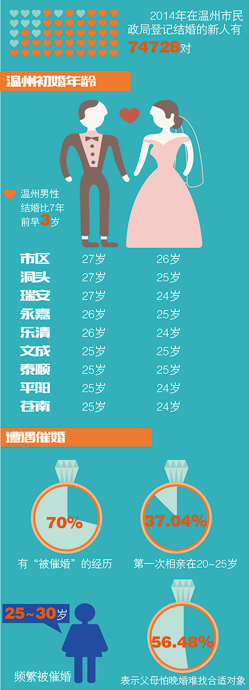 昨日,记者从温州市民政局了解到,2014年温州人初婚年龄:男27岁左右,女25岁左右。随着社会发展,男性初婚年龄与7年前相比,不仅没有延迟,反而还提早了3岁。温州人结婚年龄算早吗?有多少人曾经被家里“催婚”?温州人为什么这么早结婚?对此,记者进行了调查了解。